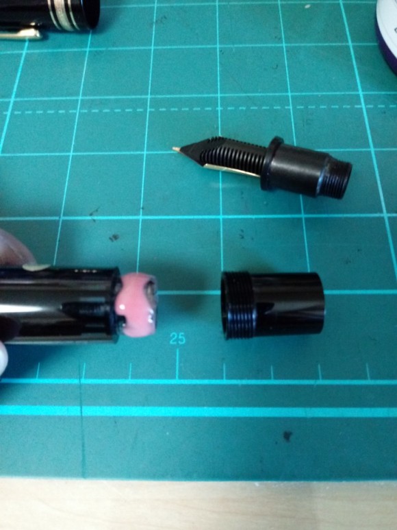파츠 전부 분해한 뒤 닙 조정 후 재결합하여 최종 확인합니다. 여기서 중요한 점이 재결합시 실링 작업이 필수입니다. 3피스 구조에서 누수가 발생하는 대부분, 거의 99.9% 개체가 해당 작업이 이루어지지 않아서 잉크가 샙니다. 나머지 1%는 최초 공장에서 실링이 미흡하게 된 개체 정도입니다. 이 작업을 일반 실리콘 그리스로 하는데 전혀 용도가 다른 약품입니다. 수리 및 복원은 최대한 오리지날리티를 살려서 작업하는 방향으로 진행하는 것이 좋습니다.