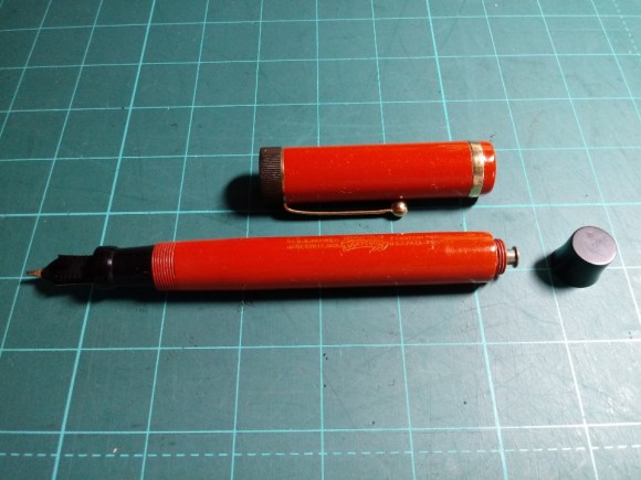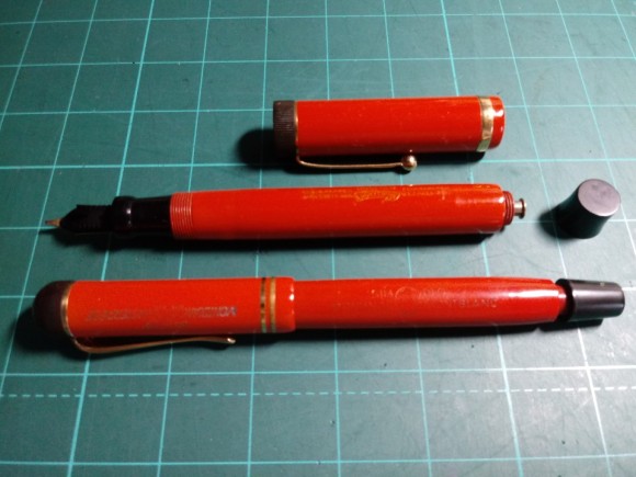 외관 자태는 코랄 레드 컬러로 당시 하드러버 염색 기술로 인기를 누렸던 디자인입니다. 비슷한 디자인으로 파카 듀오폴드 빅레드 모델이 있지요. 빅레드 역시 2밴드 버전도 존재하며 30년대 들어서 1밴드에서 2밴드가 트렌드로 바뀌는 모습입니다.