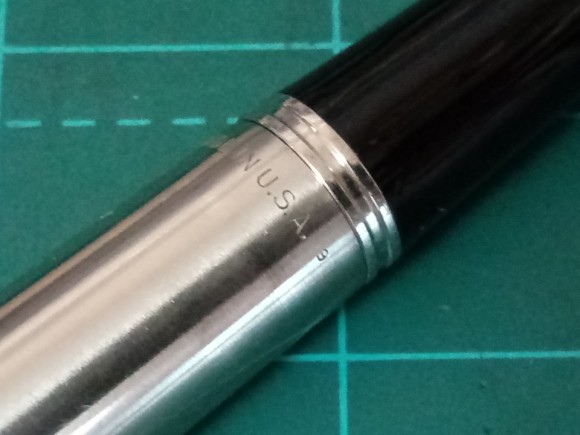파카51 플라이터엔 데이트코드가 1자리에서 시작해서 2자리로 시작하고 나중엔 사라지게 되는데 다음과 같다. 일단 최초 생산품인 1949년도 모델에는 배럴에 새겨진 MADE IN USA 다음에 9 숫자가 새겨진다. 1949년도 생산품을 뜻하며 이후 1950년대 모델에는 50 숫자가 새겨진다. 그 이후엔 배럴에 데이트코드가 사라지게 된다. 따라서 첫 생산품을 구하려면 배럴에 9 숫자 각인이 새겨져야 한다. 위 모델은 첫해 모델로 9 각인이 새겨진 것을 확인 할 수 있다.