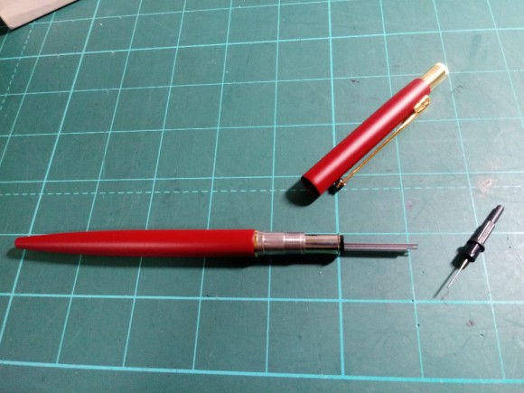 0.5mm 샤프심이 들어가기에 오늘날 무난하게 사용이 가능하며 노크감은 은은하다. 경쾌함 없이 부드럽게 배출되고 배출량은 시원시원하다. 샤프심을 넣는 방법이 조금 특이한데 뒤쪽의 노브를 빼서 넣는게 아닌 배럴을 열어 배럴 안에 있는 캡을 또 열고 넣어주는 방식이다. 지우개는 가장 바깥 노브 안에 보관되어 있는데 일반적인 샤프와는 다른 구조를 갖는다. 샤프심이 촉에 걸렸을 때 뚫어주기 위한 철심도 지우개와 내부 커버 두군데 위치한다. 각 스레드 부위가 전부 메탈 재질이라 내구성은 확실해 보인다.