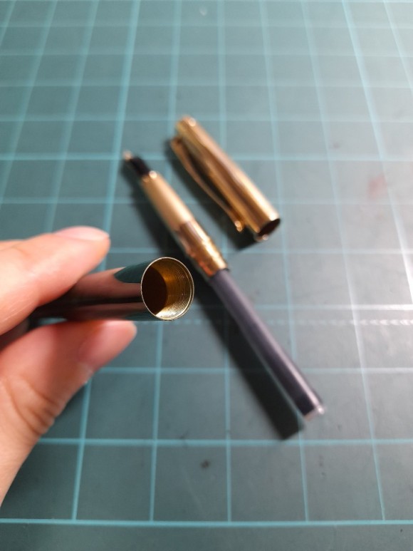그런 관점에서 펠리칸의 90년대 모델은 빈티지 연식일지 셀리브리 P590을 직접 써보면서 판단해보았다. 우선 전형적인 90년대 스타일의 기본 틀은 가지고 있다. 얇은 배럴, 푸쉬풀캡, 얇지만 메탈 재질을 사용한 묵직함 등. 이런 디자인은 90년대 국내 만년필 회사들에도 영향을 끼쳐 비슷한 형태의 펜들을 확인할 수 있다. 클래식한 디자인을 내세우는 펠리칸의 새로운 도전 정도로 보면 되지 않을까 싶다. 90년대 전형적인 스타일이라고는 했지만 기본 뼈대를 채용하고 부분 부분 개성적인 요소들이 가미되어 있어 익숙하지만 뻔하지 않는 분위기를 연출한다. 펠리칸 부리의 클립은 유지되었고 캡과 배럴 사이 간격을 두어 캡을 닫은 생태에서 흔하지 않은 모습이다. 배럴의 패턴은 자연스럽게 도색되었는데 질감은 도자기 느낌을 준다. 배럴 하단부로 갈수록 점차 얇아지고 바텀 부위에 그립부 캡과 걸리는 스토퍼를 똑같이 내주어 캡을 뒤에 꽂아도 쉽게 빠지지 않게 처리하였다.
