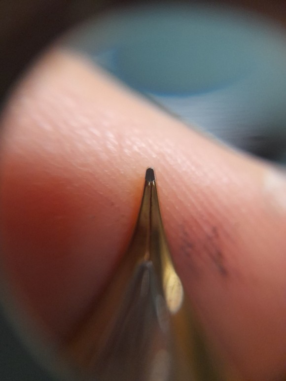 펜촉 결합까지 엉망인데 잘못 결합된지 오래되어 슬릿이 벌어지고 단차가 발생한 상태로 변형되었다. 단차 조정해주고 슬릿 간격 이상적으로 마무리. 본래 EF 수준으로 어느정도 돌아왔다. 70년대 1피스 배럴과 80년대 중반 이후의 클립, 샤크 피드 그리고 닙은 마감 상태를 보아 70년대로 보여짐. 이것저것 조립되어 케이스에까지 담아서 올라왔던 매물이다. 혹자는 7~80년대 과도기가 아니냐는 의견을 가질 수 있으나 분해흔적, 조잡한 닙 결합 상태를 보면 절대 그런 정답을 도출하기는 어렵다.