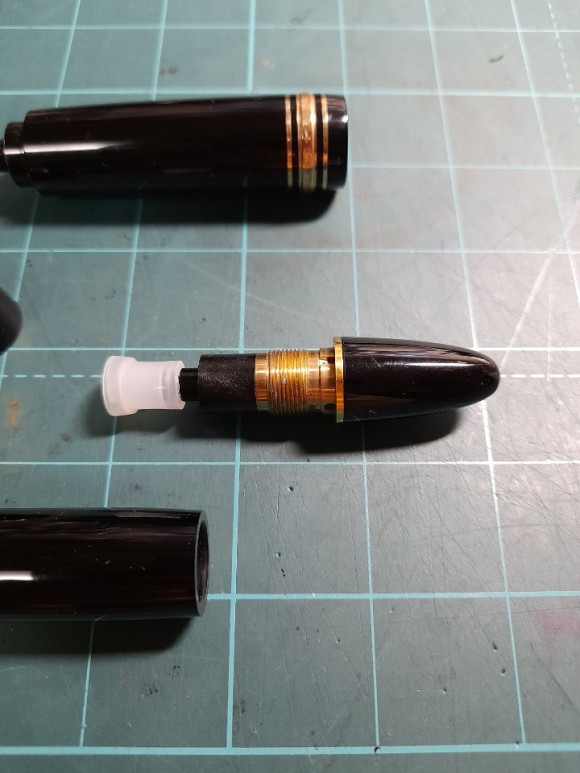 빈티지 만년필을 전문적으로 리컨디셔닝된 개체인데 분해흔적은 쉽게 찾을 수 있다. 대부분 놓치는 부분이 필러 분해 툴이 들어가는 필러 스레드 파츠다. 싸구려 수리 툴을 사용하면 들어가면서 스크래치가 발생하는데 해당 현상 확인되었다. 또한 외관은 새것처럼 폴리싱되었으나 스레드엔 흑색 잉크 흔적 확인. 애초에 필러 결합자체가 엉망이다. 피스톤 로드와 피스톤 길이가 부적절하게 결합되어 헛도는 현상 발생. 캡은 교체되었는데 대부분 캡만 따로 교체되는 케이스는 각인이 새겨져있어 캡을 따로 구하여 높은 가격에 팔기 위함이다. 연식까지 확인은 못한 것으로 보여짐.