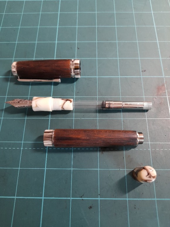 잉크 충전 방식이 조금 특이한데 일단 베이스는 컨버터 타입이다. 거기에 노브에 블라인드 캡을 추가하여 피스톤 필러처럼 충전이 가능하게끔 구현하였는데 잉크 주입량은 일반 컨버터와 동일하다. 뒤쪽의 손잡이를 길게 늘리고 노브를 뚫어놓은 것. 딱히 언급할만한 메리트가 느껴지지는 않는 기능이다. 나무 소재의 만년필은 세척시 나무에 물이 닿지 않는게 중요하므로 컨버터 타입으로 제작하는게 일반적이다. 이전 리뷰했던 펠리칸 에포크 p364도 카트리지 타입 전용이면서 배럴과 그립, 카트리지 공간을 완벽하게 분리해내어 세척이 용이하게끔 디자인 되었던걸 확인 할 수 있었다.