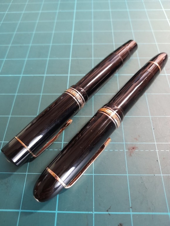 무게 밸런스만 따진다면 손에 쥐었을 때 레진 버전의 149가 가장 안정적이어야 할텐데 139와 50년대 149가 훨씬 더 안정적인 그립감, 밸런스를 준다. 이 부분은 역시나 펜의 부피, 사이즈가 지대한 영향을 미친다는 점을 보여준다. 물론 본인의 손이 서구형 체형이라 크다면 전혀 적용되지 않을 이야기라 넘어가도 좋다. 손이 작은 사람도 시가형의 두툼한 만년필을 쥐어보면 처음엔 어색하더라도 쓰다보면 적응이 되는데 길이감도 무시하지 못할 부분이라는걸 느끼게 된다. 배럴의 두께는 육안으로 봐서는 큰 차이는 없으나 수치로 따지면 셀룰로이드 버전이 미세하게 얇다.