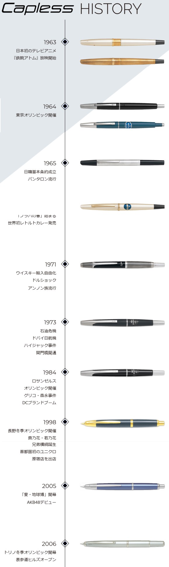 1963년식이 first year 연식이고 오늘날 형태를 갖는건 64년식부터 시작된다. 컨버터, 카트리지 방식으로 휴대시 간단하게 카트리지 교체하여 사용 가능하며 가장 큰 장점은 노크 방식으로 펜촉 배출이 이루어져 볼펜처럼 쓸 수 있다는 점이다. 만년필 특성상 사용하지 않을 경우에는 캡을 닫아주는게 좋은데 캡리스는 이름처럼 캡이 없이 노크방식으로 이루어진다.