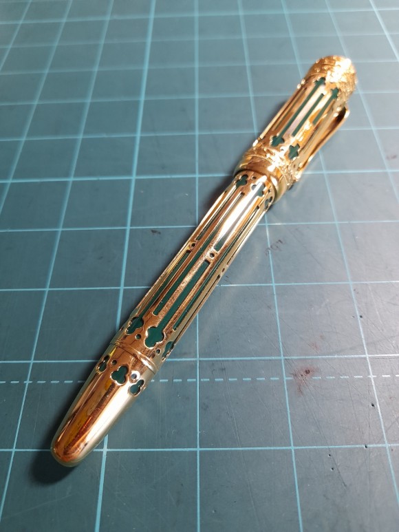 몽블랑의 한정판은 크게 두가지로 나뉘는데 149 베이스와 146 베이스다. 9호닙과 6호닙 두가지를 주축으로 제작되는데 개인적으로 위 모델처럼 금속을 두른 모델은 정말 불호인 스타일이다. 겉모습만 봐서는 남다를 것만 같은 럭셔리한 펜으로 보여지지만 실상 내부 사정은 반대다. 펜촉은 인그레이빙만 다를 뿐 80년대 18k 146 닙 보다 필감이 떨어진다. 그래도 기존 146의 14k 닙이 안쓰이는 것이 다행. 내부 메커니즘 역시 토시 하나 틀리지 않고 146과 동일하다. 오히려 배럴의 퀄리티는 기존보다 떨어진 느낌을 지울 수 없다. 한정판이라면 코스트컷 된 부분도 없이 보다 럭셔리함을 가득 채웠을거라 생각들지만 코스트컷은 그대로다. 보이는 부분만 신경을 썼지 보이지 않는 부분은 원가절감으로 가득차 있다.