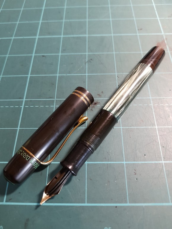 이전에도 하드러버 100N을 소개했었으나 상태가 그리 좋지 않았기에 준수한 녀석을 다시 소개해본다. 펠리칸 100N 자체가 공식적으로 소개된 연도는 1937년도 이후라서 4마리 로고가 새겨진 개체는 프로토타입인 매그넘 이머지 모델밖에 존재하지 않는다. 따라서 초기형 100N 중 금촉이 장착된 연식은 1937년식으로 특정지을 수 있으며 하드러버 재질로 제작된다. 잉크창은 갈색에 그립부가 후기형과 다른 특징을 갖는다. 나사산 앞쪽으로 접합부가 튀어나와 있으며 그립부와 잉크창 부위가 나사산 방식으로 결합된다. 결합시 셸락을 도포하여 누수를 방지해주는게 이상적이다.