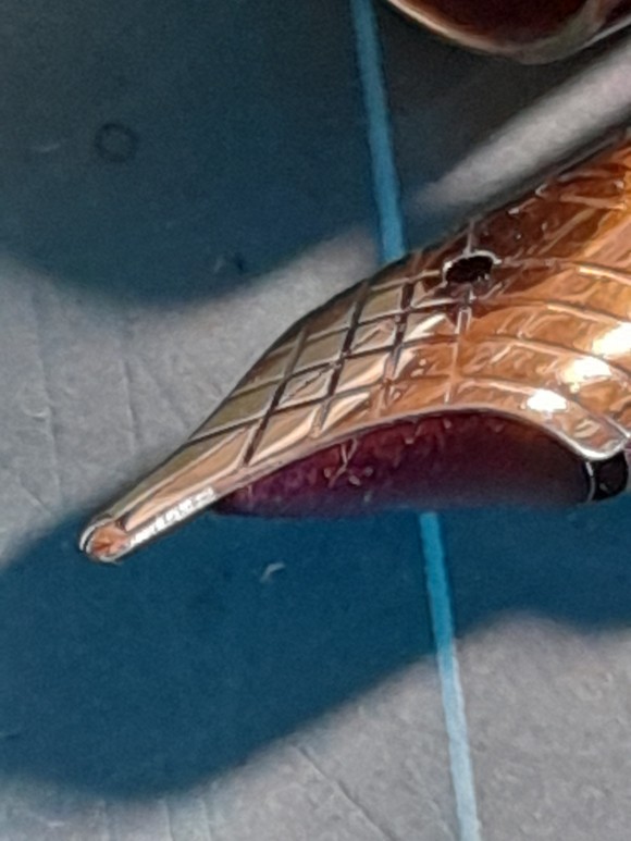 최초 낙하 이후 손대지 않고 바로 보내주어 작업이 매우 수월. 일단 펜촉의 상태는 1mm 이상의 단차, 타인의 우방향 휘어짐, 측면에서 보았을 때 30도 가량 휘어진 상태로 굉장히 심각한 충격이 가해진 것으로 보여진다. 닙 조정 순서는 우선 아래로 30도 가량 숙여진 변형부터 조정해주는게 좋다. 미세단차는 마지막에 잡으면 되므로 어느정도 평행만 대충 잡아준 뒤 상단에서 보았을 때 우측으로 1시방향 꺾인 것을 조정해준다. 마지막으로 단차 잡아주면 수리 완료다. 스틸닙, 14k닙, 18k닙 각각 조정해주는 툴들은 동일하지만 주어야 하는 힘이 미세하게 다르기에 어느정도 경험치가 필요하다. 작업하다가 닙이 끊어지는 경우도 많고 수리 이전보다 더 문제가 커질 수도 있으니 숙련도가 오른 다음 닙 작업을 하길 추천한다.