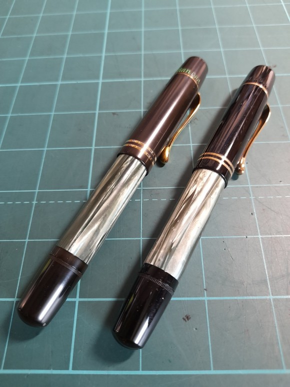 펜 자체에 포커스를 맞춰보자. 우선 좌측의 모델은 극초기형의 하드러버 버전이며 우측의 모델은 초기형 셀룰로이드 버전이다. 둘다 초기에 제작된 버전이라 잉크창은 짙은 호박색을 띠는 모습이다. 그립부의 접합부 가공 역시 동일하나 그립부 파츠, 노브 파츠와 캡 등이 셀룰로이드로 이루어진게 차이점이다. 또한 가장 큰 차이점은 피스톤 씰의 변경 포인트다. 극초기 모델에선 100N에서도 100의 감성인 코르크 씰을 느낄 수 있다. 이점이 개인적으로 꼽는 가장 매력적인 부분이다. 피스톤 씰 하나의 차이가 빈티지한 감성의 3할 이상은 차지한다고 본다. 초기형 오링 형태의 피스톤 씰은 오히려 내구성이 약해 후기형 두꺼운 레진 씰 보다 단점이 많다. 물론 오링 타입의 씰도 열가공하여 마모가 이루어져도 충분히 복원은 가능하다.