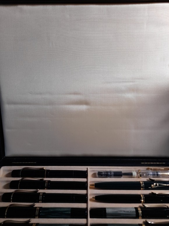 크기는 일반 서적 사이즈 2개정도 붙여둔 느낌이며 무게는 굉장히 가볍다. 하드케이스들은 대부분 무겁기 때문에 휴대가 어려운데 휴대성을 높인 제품으로 보여진다. 내구성면을 본다면 일단 모델 자체가 1980년대 제품인 것을 감안하면 안좋다고 말할 수가 없다. 어디 한군데 까진데 없고 깔끔하게 보존되었다. 연식으로 따지면 40년 전 모델이다. 로고 프린팅 까진 곳도 없고 모서리 부분도 깨끗하다. 아마 해당 모델을 요즘 중국제 수준으로 제작했다면 1~2년만에 겉 커버가 뜯어지기 시작하지 않았을까 생각해본다. 만년필을 보관한다면 되도록 하드케이스를 추천한다. 휴대할 때도 마찬가지다. 일반 가죽 파우치에 휴대하다가 크랙이 생기는 경우를 한두번 본 것이 아니다. 수리 들어오는 대부분의 펜들이 파우치에 보관하고 안심했을 때 일어난 문제들이다.