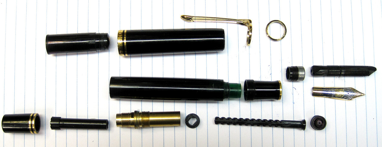 클립도 캡탑을 돌려 열어 클립을 간단하게 탈착이 가능하다. 유일하게 빈티지에서 변경된 부분은 필러 파츠인데 빈티지 모델들은 필러 스레드 부분을 손으로 잡아 돌리면 열리지만 현행은 전용툴을 이용하여 열어줘야 한다. 일부 수집가들은 필러 작동시 스레드까지 돌아가버리는 현상으로 인해 툴을 쓰는 것이 더 낫다고들 하지만 단지 씰링이 잘 작업되지 않아 나타나는 현상이다. 만년필의 모든 스레드 파츠 결합시엔 셸락 사용이 필수적이다. 셸락은 단순히 방수역할 뿐만 아니라 고정력을 높여주기 때문이다. 오랫동안 사용하기 위해서는 어떤 물건이든지 분해결합이 용이한 것이 유리하다. 분해결합이 어려운 대표적인 모델이 60년대 초반의 몽블랑 149 모델인데 피스톤이 뻑뻑하다고 섣불리 필러 분해해서 오일링하기엔 파손 위험이 크다. 구조상, 연식에 따른 내구도 문제인데 이럴 때는 최대한 분해시점을 늦추는게 수명을 늘리는 유일한 방법이다. 피스톤 씰에 누수가 발생해서 잉크가 넘어가는 시점이 되어서야 분해를 해주는걸 추천할 정도. 펠리칸은 이런 걱정 하나 없이 누구나 손쉽게 분해결합을 할 수 있으니 초보자들에게도 추천해주는 상급 모델이다. 한가지 주의할 점은 위의 사진처럼 닙과 피드, 하우징 파츠를 분해하는건 지양하는게 좋다. 기껏 내 필각에 맞게 슬릿이 열린 것이 틀어지기 때문. 다시 결합하여 쓴다면 헛발질이 발생할 수 있다.