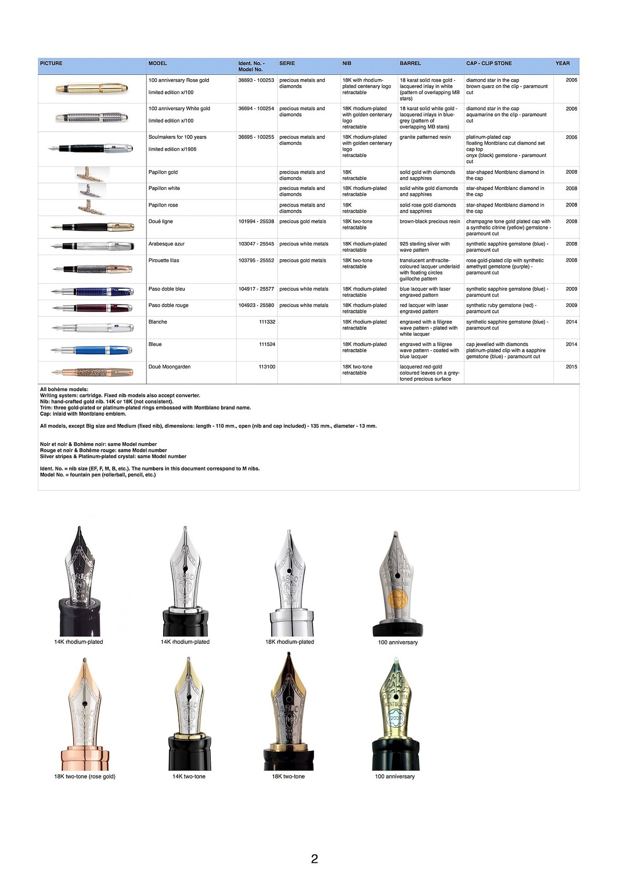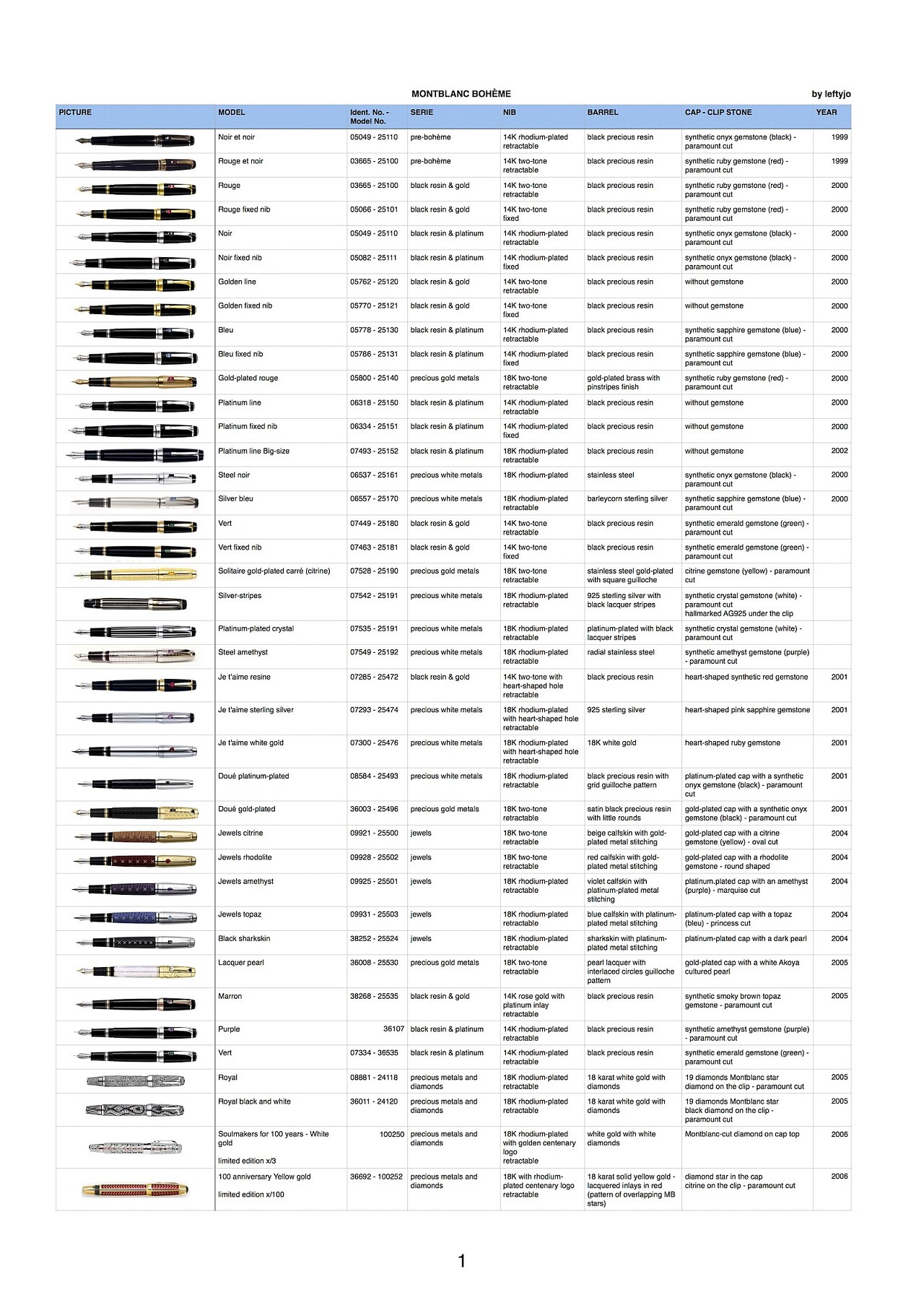 20세기 말 처음 선보인 보헴 라인업은 다소 충격적이었다. 그 충격은 크게 두가지로 나뉘는데 첫번째 충격은 디자인이다. 몽블랑은 굉장히 보수적인 성향의 브랜드인 것은 다들 이해할 것이다. 그들의 디자인은 100년간 크게 바뀌지 않고 엇비슷하게 이어져 오고 있는데 가장 큰 변화라고 해봤자 각져있던 엣지가 완만한 곡선을 그리게끔 전환된 정도 뿐이다. 그런 몽블랑에 익숙해져 있던 시장은 보헴의 등장으로 다시 뜨거워졌고 두번째 충격으로 넘어가게 된다. 보헴의 두번째 충격은 유저들의 피드백에 즉각적으로 반응했다는 점이다. 흔히들 알고있는 보헴은 위 사진처럼 쥬얼이 박힌 클립에 리트랙터블 되는 닙으로 인식되어 있지만 의외로 여러가지 버전들이 존재한다. 첫번째 클립에 쥬얼이 박혀있는 여성용 모델과 쥬얼이 제외된 클립의 노 스톤 버전. 여성이 아닌 남성 사용자들의 의견을 반영한 빅 사이즈 버전과 그에 따른 스톤 유무에 따른 두가지 버전. 마지막으로 펜촉을 수납하는 리트랙터블 기능이 빠진 고정형 버전까지 다양하게 구성되어 있다. 아마도 몽블랑 애호가더라도 보헴이 이정도로 다양한 버전으로 생산되었다는 사실을 아는 이들은 소수일거라 생각든다.