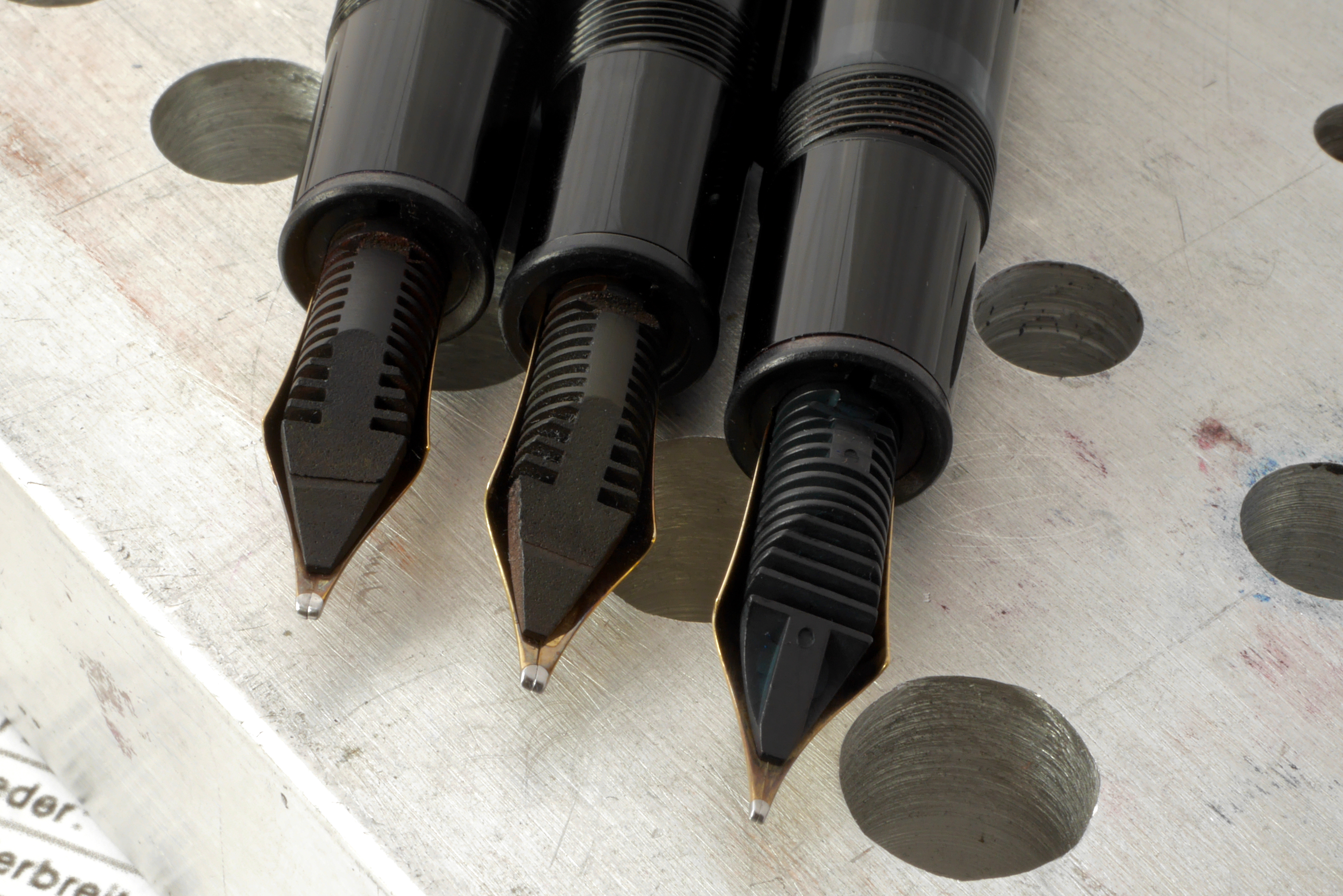 70년도엔 솔리드 에보나이트 피드, 80년도엔 스플릿 에보나이트 피드가 장착되며 과도기 연식에 장착되는 피드는 에보나이트 피드의 마지막 버전인 스플릿 피드가 장착된다. 일명 샤크피드로 불리우며 옆모습이 상어의 얼굴처럼 보인다. 샤크피드는 에보나이트 피드 중 피드 안정성을 가장 높여 어느정도 충격에도 잉크를 뱉지 않아 실용성이 높은 평가를 받고 있다. 내구성 이슈가 있다고도 하지만 지금까지 십여년을 사용해왔지만 멀쩡히 사용중이다. 에보나이트 피드의 내구성을 의심하는 이들은 대부분 누군가 건드렸거나 분해과정 중에 파손하는 경우가 100%다. 1900년대 초반 아주 얇게 가공된 피드가 아닌 이상 post war 연식의 에보나이트 피드들은 오히려 플라스틱 피드 보다도 내구성이 좋다. 이제 내가 필요로하는 에보나이트 피드와 투톤닙 디자인이 모두 적용되었다. 일부러 파츠들을 따로 구입해서 튜닝한 제품이 아닌 당시 오리지날로 생산되던 연식이며 과도기 생산품이라 아주 적은 개체만이 확인된다. 조합품이 아닌지 확인하는 방법은 클립의 W.GERMANY 각인을 확인하면 된다. 잉크창은 스트라이프가 없는 것도 있는 것도 있으며 이외 추가적인 스레드 구분은 분해를 해야하므로 패스한다. 현행 디자인을 즐기면서 빈티지 성능을 즐길 수 있는 하이브리드 연식이라고 정리한다.