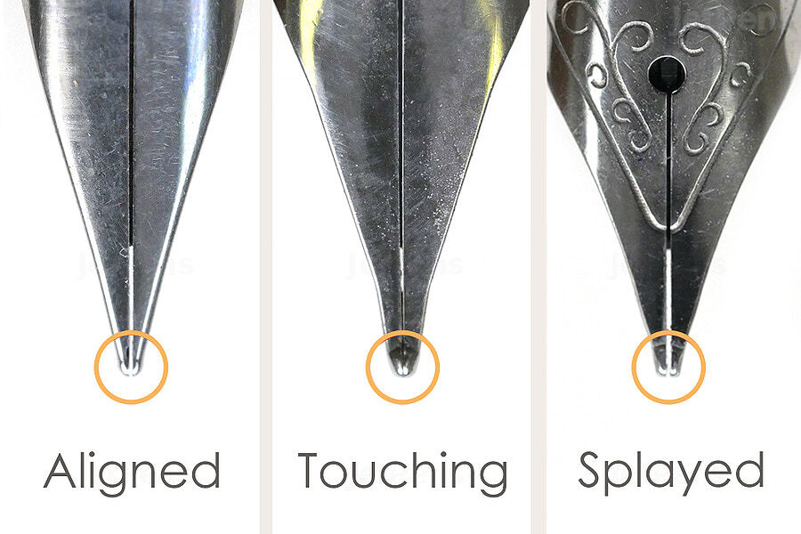 위 사진만 보더라도 커뮤니티 상에서 만년필에 대한 이해도가 얼마나 부족한지 알 수 있다. 첫번째 사진이 정렬된 것으로 가장 이상적인 펜촉이라고 말하지만 사진처럼 티핑 끝자락이 붙지 않고 떨어져 있으면 필기과정에서 종이 찌꺼기가 티핑에 계속 끼게 된다. 만년필을 쓰다보면 펜촉 끝에 볼펜 똥처럼 생기는 개체들은 전부다 첫번째 정렬된 닙에서 발생한다. 그 현상은 세번째 벌어진 닙에서 더 정도가 심하게 나타나는데 수리가 필요한 수준이다. 만년필에 있어서 가장 이상적인 정렬은 두번째 사진 붙어있는 상태다. 슬릿이 붙어있으면 잉크흐름이 부족하고 답답하다는 주장을 하는 경우도 있는데 이는 하트홀 부근까지 전부 닫혀있는 경우이고 사진처럼 하트홀에서부터 티핑으로 이어지는 라인이 삼각꼴을 이룬다면 흐름에 전혀 지장 없고 가장 이상적으로 쓸 수 있는 상태가 된다. 티핑은 닫혀있어야 한다. 하트홀로 올라가는 슬릿은 열려있어야 한다. 이게 정답이다. 티핑 부근은 닫혀있어도 필압이 가해지면 자연스럽게 열리고 필압없이 닫혀있는 상태에서도 잉크공급은 원활히 이루어져 종이 찌꺼기가 생기지 않고 자연스럽게 필기가 가능하다. 티핑 끝이 닫혀있다고 잉크가 안나오는게 아니며 티핑의 아랫면 홈을 따라 모세관 현상으로 흘러나오기에 첫번째 사진처럼 열려있지 않아야 한다.