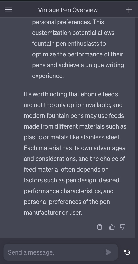 | 챗GPT: 만년필에는 어느재질의 피드가 적합한가? (1) | 2023.06.13 |