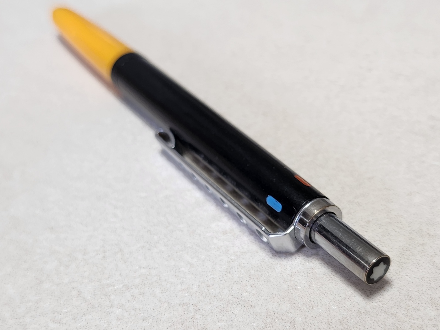 중학생 때 파커 제품의 중력 멀티펜을 처음 접했을 때가 생각난다. 대부분의 멀티펜들은 원하는 색상의 레버를 내려 사용하는데 중력 멀티펜은 원하는 색상 표기를 바라보고 뒤쪽에 하나 달린 노브를 누르기만 하면 원하는 색상이 나온다. 무게 추를 이용하여 색상 배치를 반대로 한 구조로 작동하는 원리인데 신기하고 재미는 있으나 사실상 실용성이 떨어져서 판매율이 저조한 편이다. 결국 중력 멀티펜은 현재 입지를 잃고 대부분 단종되거나 사라져버렸다. 시선을 맞추더라도 펜의 각도에 따라 다른 색상이 튀어나오는 경우도 빈번하여 실용성이 떨어지는 것이다. 또한 그냥 원하는 레버를 내려 사용하는게 속도도 빠르고 정확하다. 시선을 맞추는 번거로움이나 원하는 레버를 내리는 것이다 별반 차이가 없다. 처음엔 신기하지만 쓰다보면 불편해서 결국 4 레버 멀티펜을 쓰게 된다. 유독 중력 멀티펜은 파커, 몽블랑, 로트링 등 고가 브랜드에서 자주 보인다. 아무래도 다양한 색상을 필요로하는 이들에게 4개 색상이 다른 레버가 달려있는 뚱뚱한 볼펜의 디자인을 타개하기 위함이 아니었을까 싶다. 디자인이 심플해짐으로써 고급스러움을 가미할 수 있게 된 것. 하지만 이번에 리뷰하는 몽블랑의 카레라 모델은 고급스러움과 다소 거리가 있어보인다.