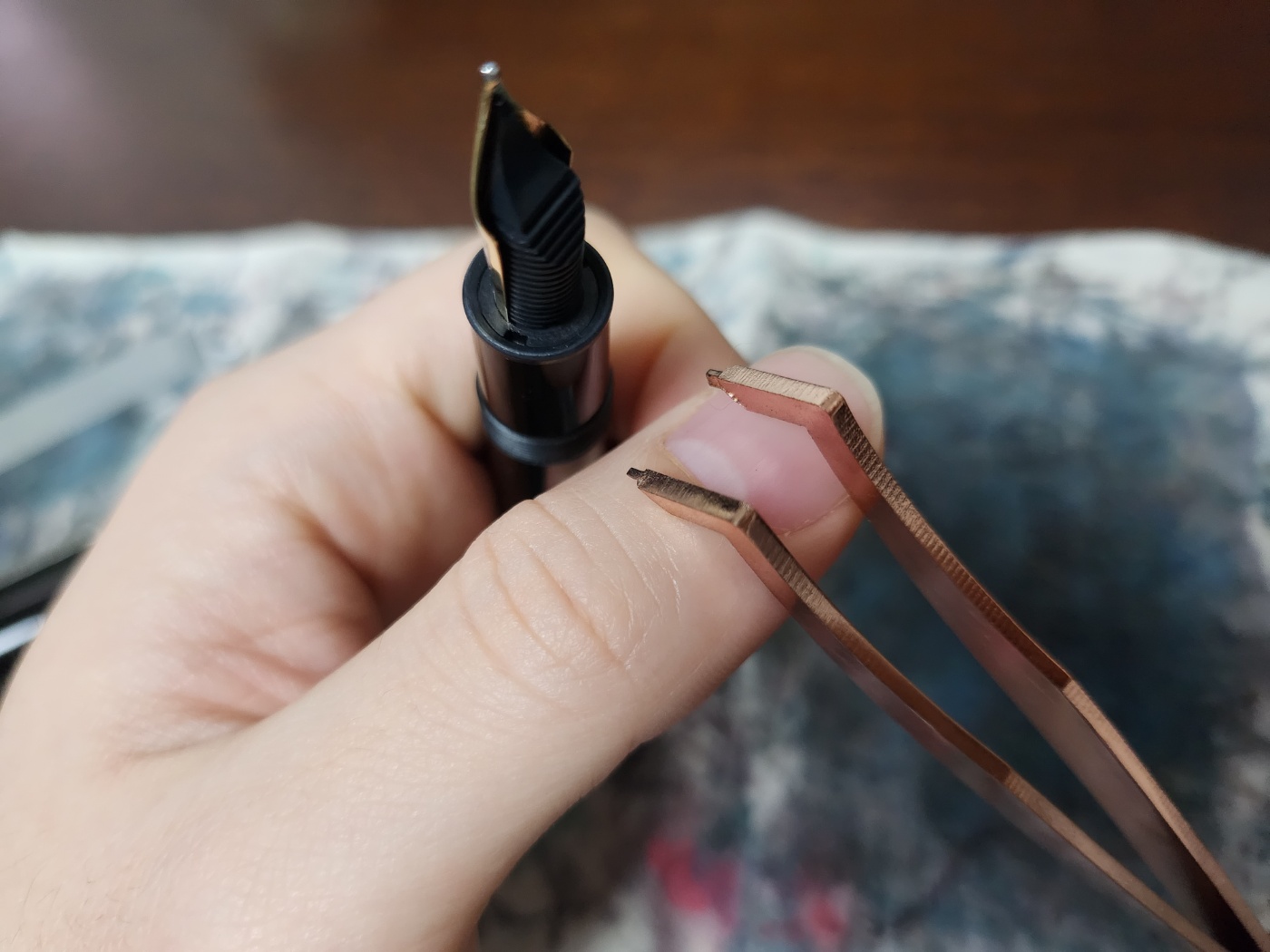 만년필 중 가장 많이 고장나는 파츠는 바로 닙파츠다. 어떠한 경우들이 있냐면 먼저 가장 많은 경우가 닙을 떨어트리거나 강한 필압으로 인해 펜촉 변형이 온 경우다. 이를 수리하기 위해서는 닙이 결합되어 있는 상태에서는 절대 작업해서는 안된다. 이유는 간단한데 피드와 닙이 결합되어 있는 상태에서는 아무리 조정해도 조정이 불가능하며 강제로 조정하는 경우 피드의 변형이 올 수 있으며 닙을 조정하는 과정중에 피드와의 유격이 더 벌어질 수 있다. 또한 닙이 피드와 강하게 결합되어 들어가는 구조이므로 완전 분해 후 닙만 따로 조정한 뒤에 피드와의 결합하면서 추가적인 조정까지 필요하다. 닙을 100% 조정했다 한들 피드와 결합하면서 또 틀어질 수 있기 때문이다. 아니 대부분이 틀어지게 된다. 피드가 헐렁하게 결합이 된다면 조정된 닙에 힘이 가해지지 않겠지만 굉장히 타이트하게 서로 밀착하면서 결합되므로 분해 상태가 아닌 결합상태에서의 닙을 보고 세팅해야 한다. A 쉐잎 변형이 주로 초보자들이 닙 분해결합 후 발생하는 경우가 많은데 결합 상태에서 조정까지 봐주지 않았기 때문이다.