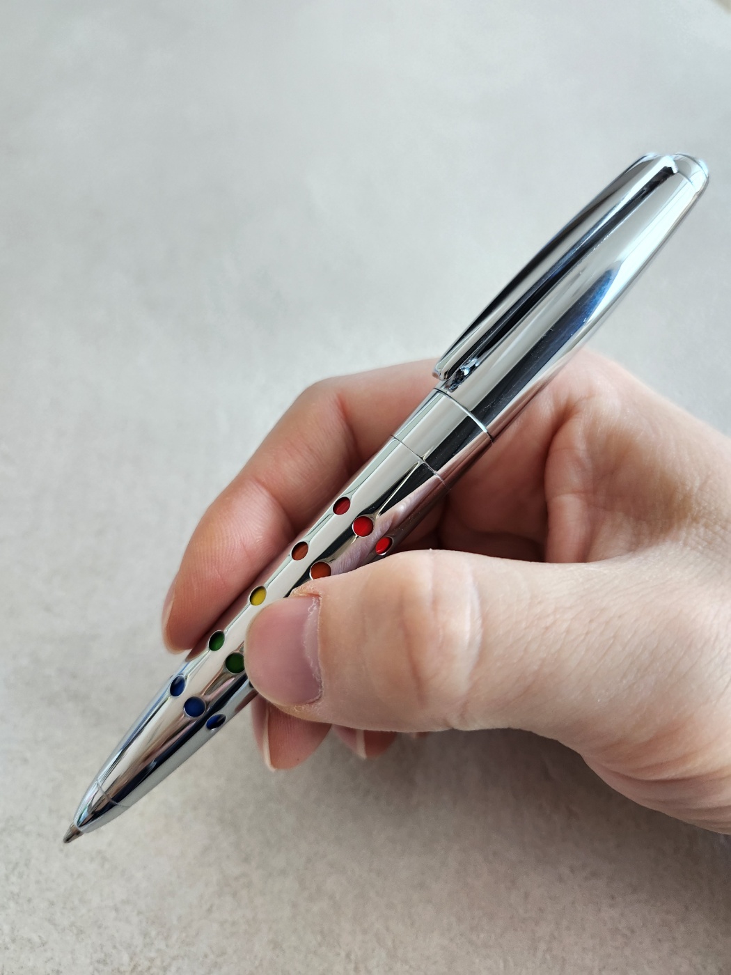 컬러 스펙트럼 도트들은 멀리서 언뜻 봤을 때는 펜의 배럴 바깥으로 튀어나와 마치 샤프 그립부의 미끄럼 방지의 고무같은 인상을 받았으나 상자에서 꺼내고 실물을 확인하니 오히려 안쪽으로 들어가 있는 깊이감을 주는 디자인이었다. 이런 느낌을 줄 수 있었는 요인은 빨강색 도트부터 파란색으로 갈수록 깊이가 깊어지면서 입체감이 강조되었기 때문이다. 심플한 듯 보이지만 전혀 심플하지 않으며 여기서 끝이 아닌데, 볼펜심을 수납할 때는 컬러 도트가 사라지는 흥미로운 메커니즘을 경험하게 된다. 볼펜을 사용하지 않고 보관할 때는 올 스텐의 실버 컬러를 보여주고 사용시에 펜을 트위스트하여 볼펜심을 배출하면 배럴의 도트들이 무지개 색을 입게 된다. 센세이셔널하지 않은가? 무게감도 좋고 국제호환규격 리필심 사용으로 실용성까지 겸비했다. 단순 디자인 제품이 아닌 실용성까지 겸비했으며 미사용시엔 심플한 디자인으로 변신까지 할 수 있는 그야말로 완벽한 디자인 상품이다.