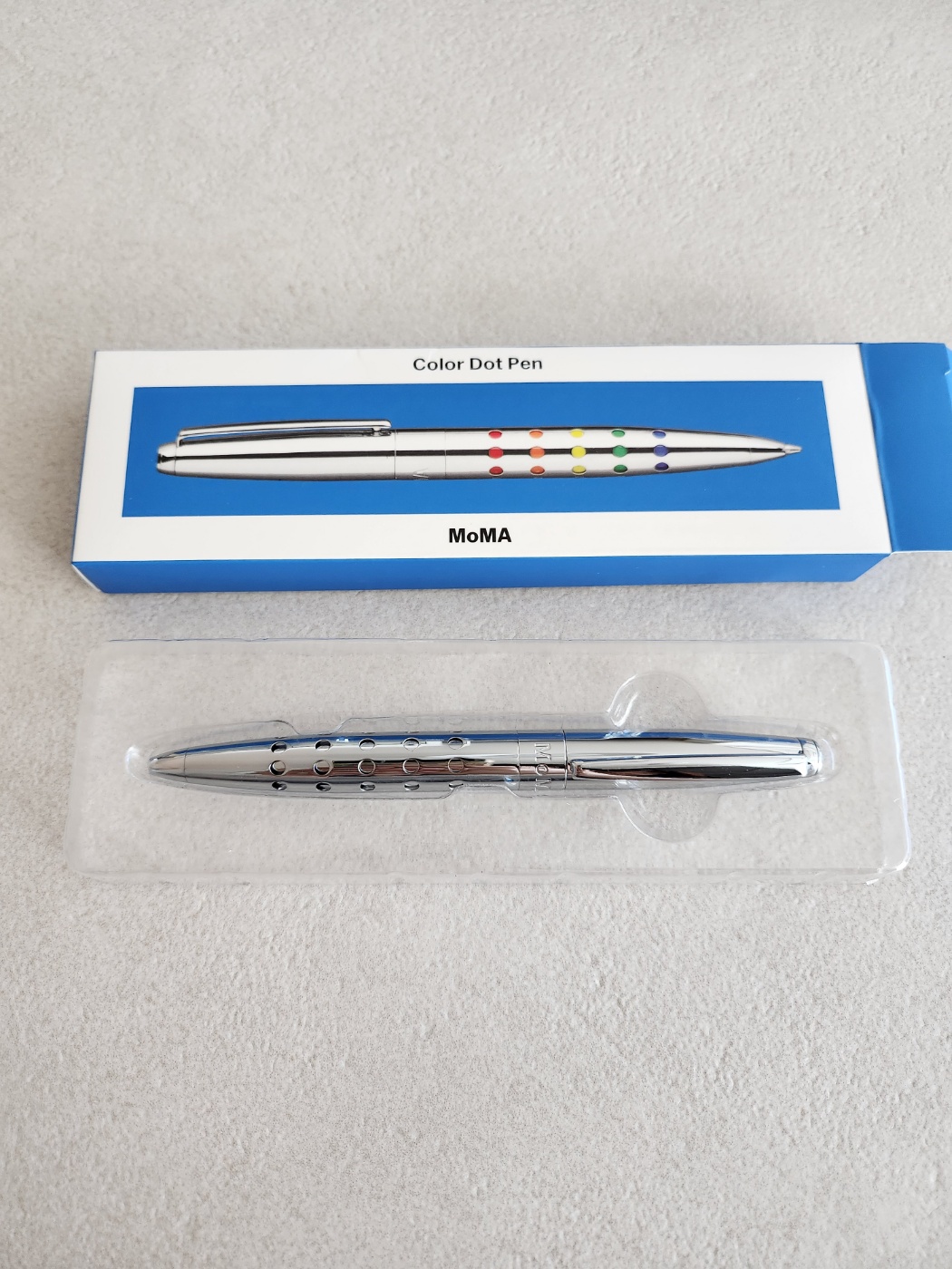 일단 MoMA에 대해 설명이 필요하다. MoMA는 Museum of Modern Art의 약어로 순수미술 뿐만 아니라 건축, 시각디자인, 산업 등 다양한 영역을 다루며 최근 미술 트렌드를 한눈에 볼 수 있는 박물관이다. 박물관에서 운영하는 기념품샵, 모마 디자인 스토어에는 다양한 디자인이 접목된 소품들을 판매하는데 그 중에 한 볼펜을 소개하고자 한다. 디자인 스토어에 진열되어 있는 상품들은 다양한 색을 절묘하게 상품에 접목 시켰는데 그 컬러는 특이한, 혼합 색들이 아닌 아이들도 흔히 아는 무지개 원색들을 사용한다. 오히려 흔한 색을 사용함으로써 평범한 일상에 녹아들기 쉽다는 취지인 셈이다. 리뷰하는 제품에도 무지개 색상 중 빨강, 주황, 노랑, 초록, 파랑색만을 사용했으며 이 원색은 굉장히 친근하게 다가온다. 친근한 색상으로 처음 보자마자 나 역시 시선이 바로 향했고 쉽게 끊어지질 않았다. 단순하지만 확실하게 주의를 끄는 디자인이다.