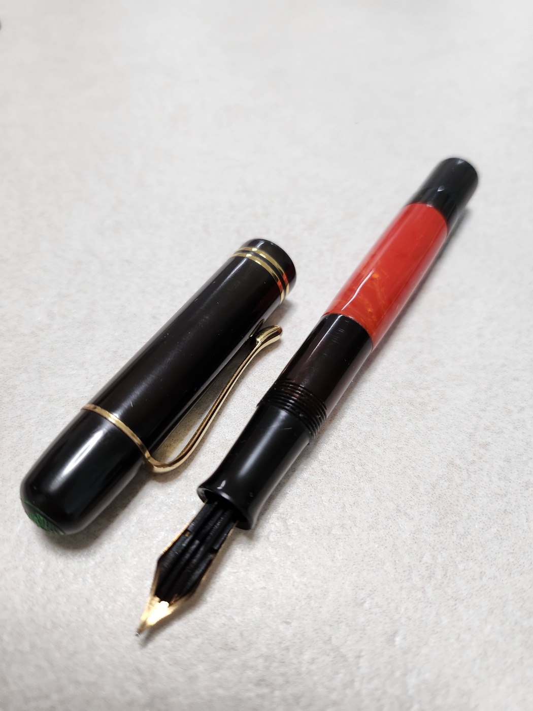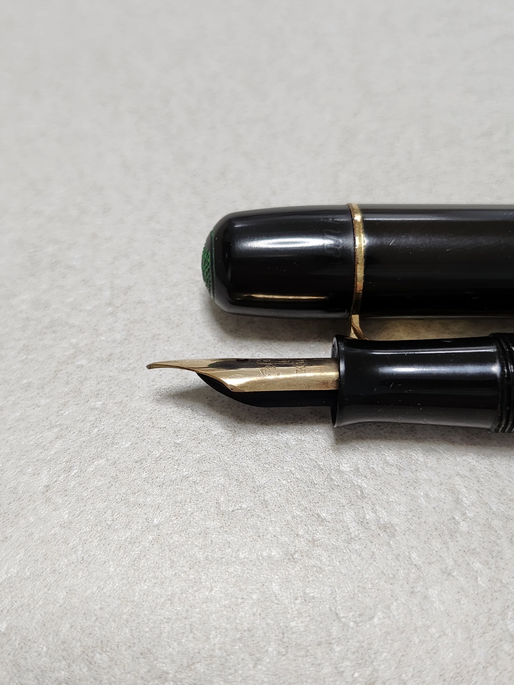 닙은 F닙이 장착되었고 14c 금촉에 벤딩 가공이 작업되어 있다. 다른 포스팅에서 언급을 했지만 몽블랑은 EF 닙에서 벤딩 가공을 볼 수 있고 펠리칸은 EF~F에서 벤딩 가공을 볼 수 있다. 2010년대까지만 하더라도 펠리칸은 독일 브랜드, 유럽 브랜드 치고 세필 성향이 강했었다. 그런 성향은 과거부터 이어졌는데 빈티지 펠리칸의 닙은 일제 닙 수준으로 세필이다. 그렇기에 F닙 두께라도 몽블랑의 EF닙보다 얇게 그어져 벤딩 가공이 필수였던 것이다. 개체편차는 존재하지만 잉크창 재질도 초기형 호박색 보다 후기형 그린색 잉크창이 체온 전달이 덜한 편이다. 빈티지 펜의 체온 문제에 따른 잉크 배출 문제는 사실상 실사용시 크게 문제가 되지는 않는다. 손에 쥐고서 사용하지 않은 채로 펜촉을 아래로 수십초 이상 들고 있어야 떨어지기 때문인데 그런 경우는 드물고 대부분 그립에 손을 쥐고서 몇초 이내에 필기에 들어가기에 체온에 따른 잉크 토함은 직접 경험하기는 쉽지 않다.