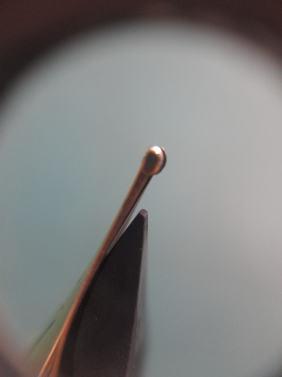 슬릿 간격이 지나치게 벌어져서 우선 슬릿 간격부터 좁히는 작업 수행. 조금씩 천천히 작업해주며 조정해준다. 슬릿이 완벽히 닫히기 전에 단차를 잡아준다. 슬릿이 완전히 닫힌 상태에서 단차조정을 하게 되는 경우 슬릿 절단면 사이에 스크래치가 생겨 필기시 해당 스크래치를 타고 잉크가 넘어와 닙 윗면에 잉크 맺힘 현상이 발생. 하트홀에서 티핑 끝점으로 갈수록 A 쉐잎을 그리는 형태로 좁혀준다.